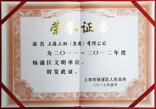 2013年上海市精神文明建设工作会议顺利召开后,新一届的文明单位陆续受到命名和表彰。近日,上海三湘(集团)有限公司再次被上海市人民政府、杨浦区人民政府命名为2011—2012年度“上海市文明单位”、“杨浦区文明单位”。成功蝉联四届“上海市文明单位”称号、五届“杨浦区文明单位”称号。