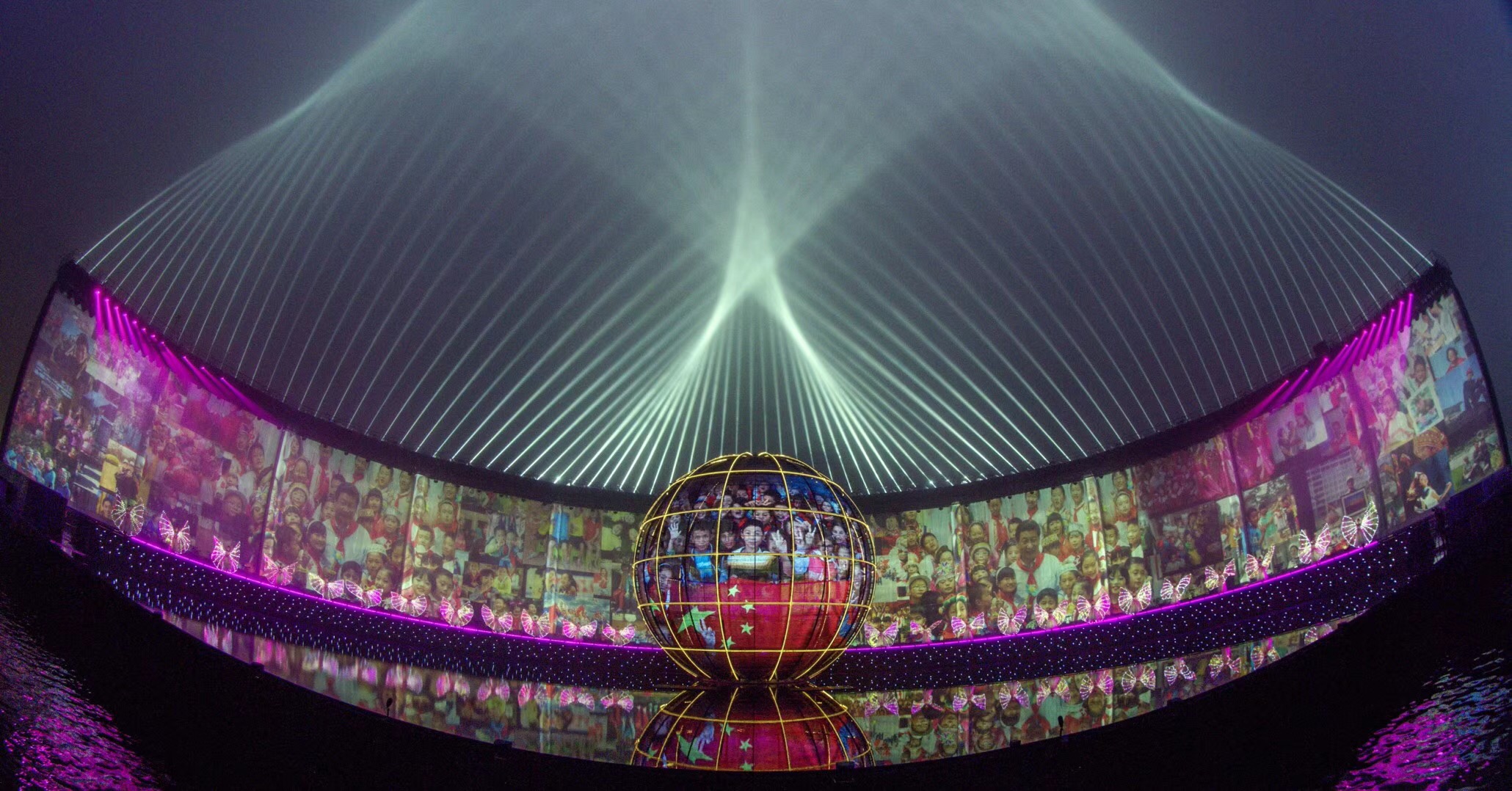 光焰艺术表演《有朋自远方来》区别于以往传统演出形式,将中华传统文化与现代科技相交融,以天为幕,以海为台,以城为景,将舞台搭建在大海之上,通过海上舞台多媒体球面视频、环幕投影与海岸线城市景观楼体相结合,创造性地将青岛的城市夜景融入舞台表演之中。