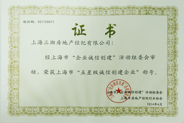 经上海市“企业诚信创建”活动组委会、上海市房地产经纪行业协会审核,2014年4月24日,上海三湘房地产经纪有限公司荣获上海市“五星级诚信创建企业”称号。目前“五星”评级,也是上海市房地产行业“诚信创建企业”的最高评级。