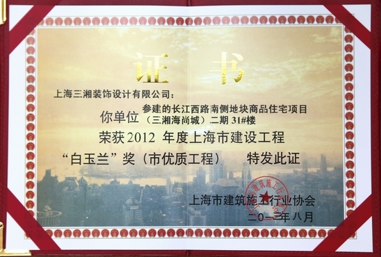 在2013年8月1日召开的2012年度上海市建筑施工企业综合实力排名、上海市建筑业诚信企业、上海市建设工程“白玉兰”奖、上海市建设工程优质结构奖颁奖大会上,由上海三湘建筑装饰工程有限公司承建、上海三湘装饰设计有限公司参建的长江西路南侧地块商品住宅项目——三湘海尚城二期30号楼、31号楼荣获2012年度上海市建设工程“白玉兰”奖。