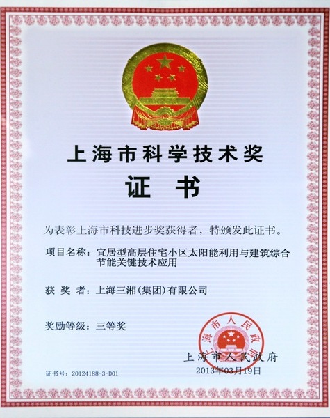 上海三湘(集团)有限公司《宜居型高层住宅小区太阳能利用与建筑综合节能关键技术应用》项目荣获上海市科技进步三等奖,该项目主要完成人还包括公司技术团队许文智、黄建、刘晓燕、肖强、李力群等。