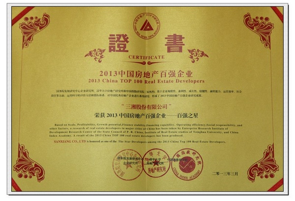 日前,由国务院发展研究中心企业研究所、清华大学房地产研究所和中国指数研究院三家机构共同举办的中国房地产百强企业研究成果公布,三湘股份有限公司荣获“2013中国房 地产百强企业”,这也是公司连续第九年荣膺这一称号。