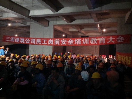 3月8日,三湘建筑公司宝山项目部以新进民工为主组织所有建筑工人展开了一场别开生面的岗前安全教育培训大会,到会民工主动签到,有序入座。培训通过播放幻灯片的形式,把建筑领域频频发生的安全事故对工人进行了有针对性的教育。